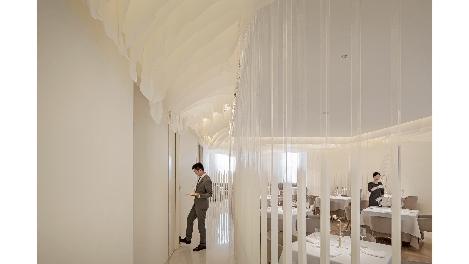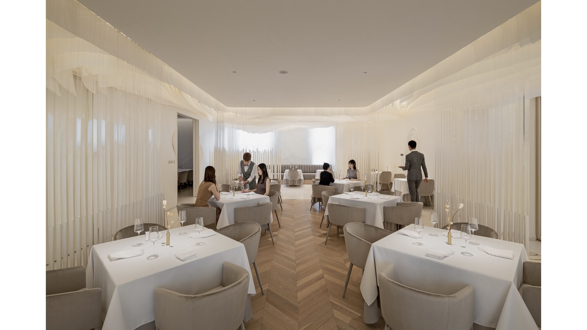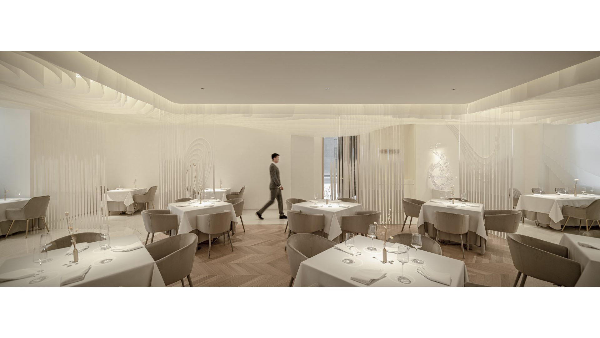 The design inspiration comes from the moment when the sense of taste is stimulated by delicious food as if the water ripples in the mouth, evoking the senses throughout the body, fully immersed in the French gourmet experience with a long and lingering aftertaste. Using water as the main design element, the designers choose white color to keep the whole space pure and clean, just like the white canvas set off a feast and create a sense of ritual for the dining experience.