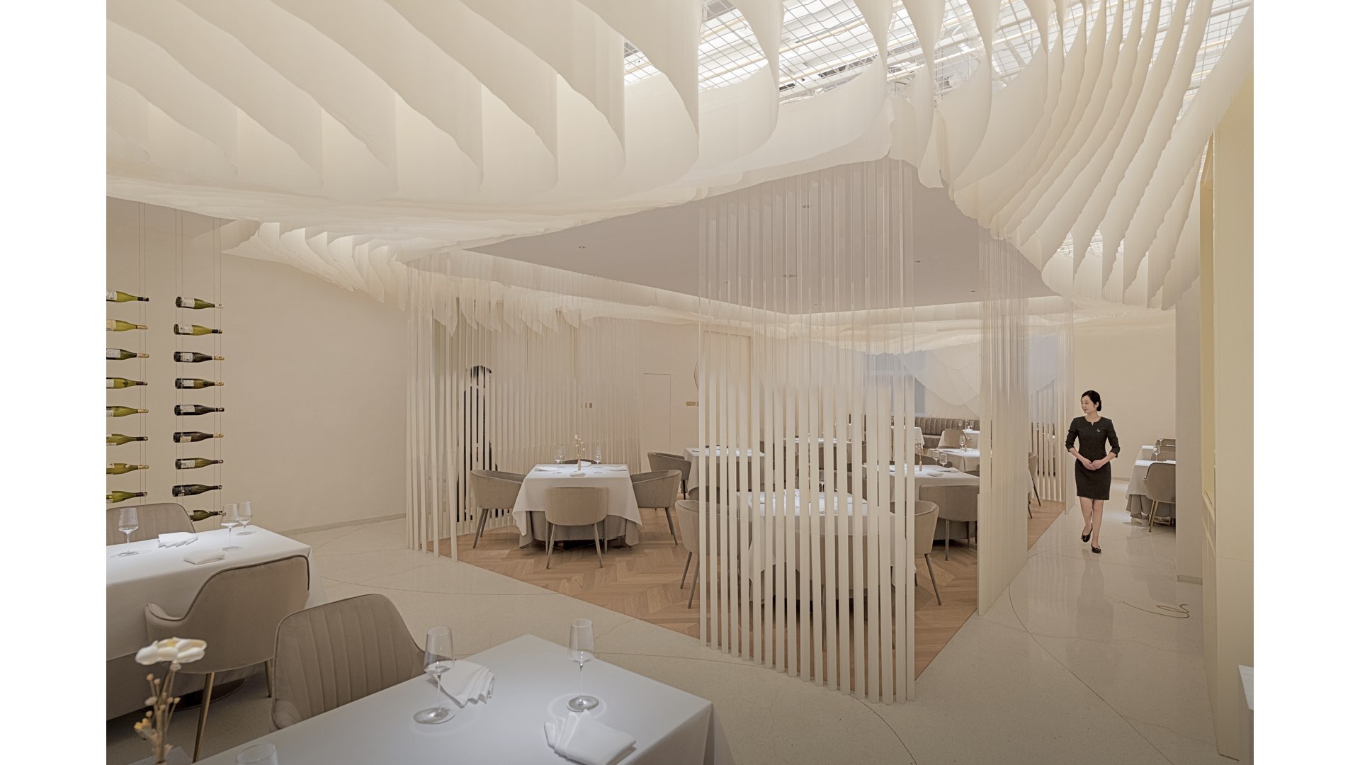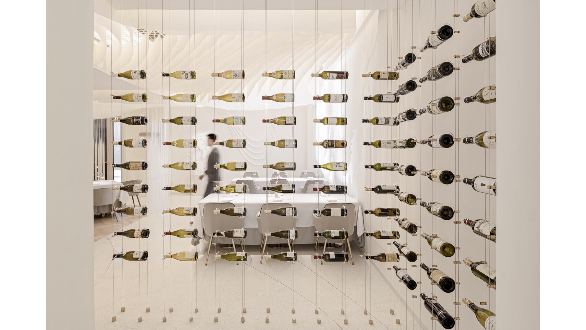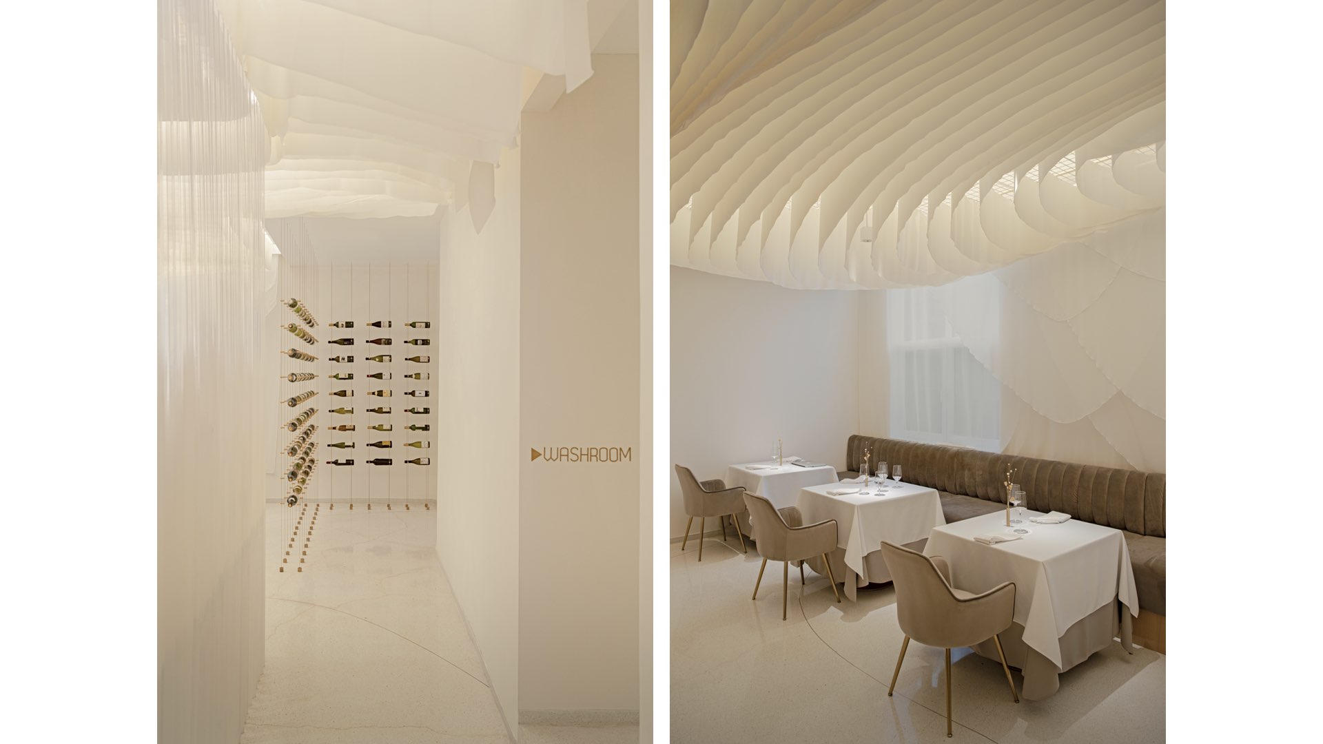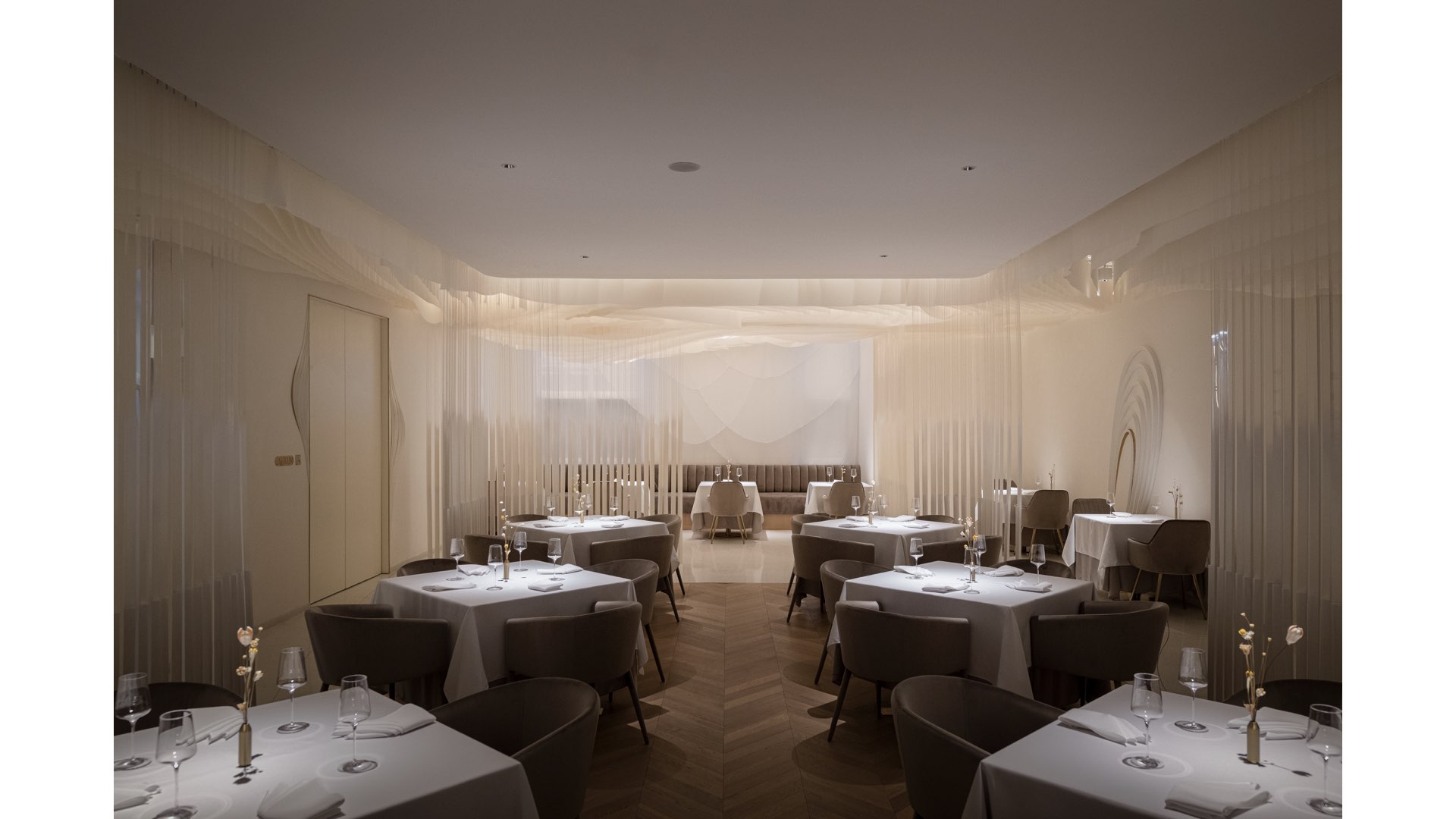The design inspiration comes from the moment when the sense of taste is stimulated by delicious food as if the water ripples in the mouth, evoking the senses throughout the body, fully immersed in the French gourmet experience with a long and lingering aftertaste. Using water as the main design element, the designers choose white color to keep the whole space pure and clean, just like the white canvas set off a feast and create a sense of ritual for the dining experience.