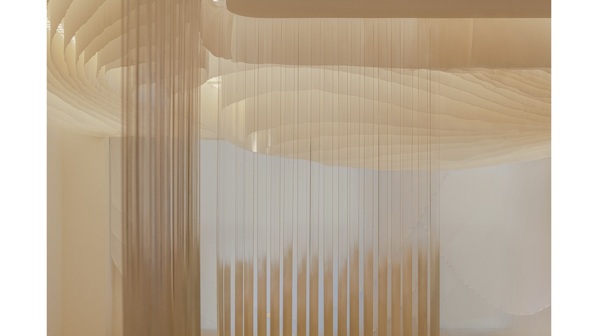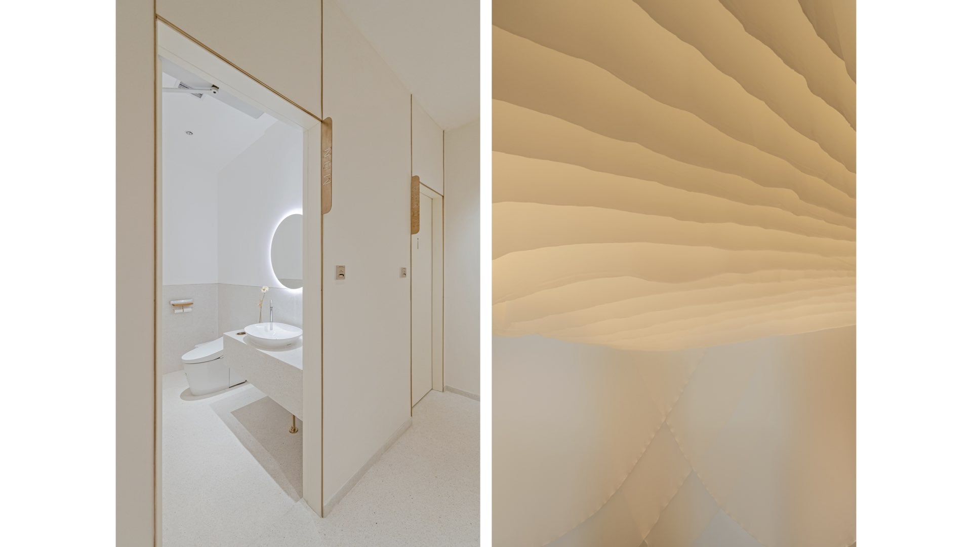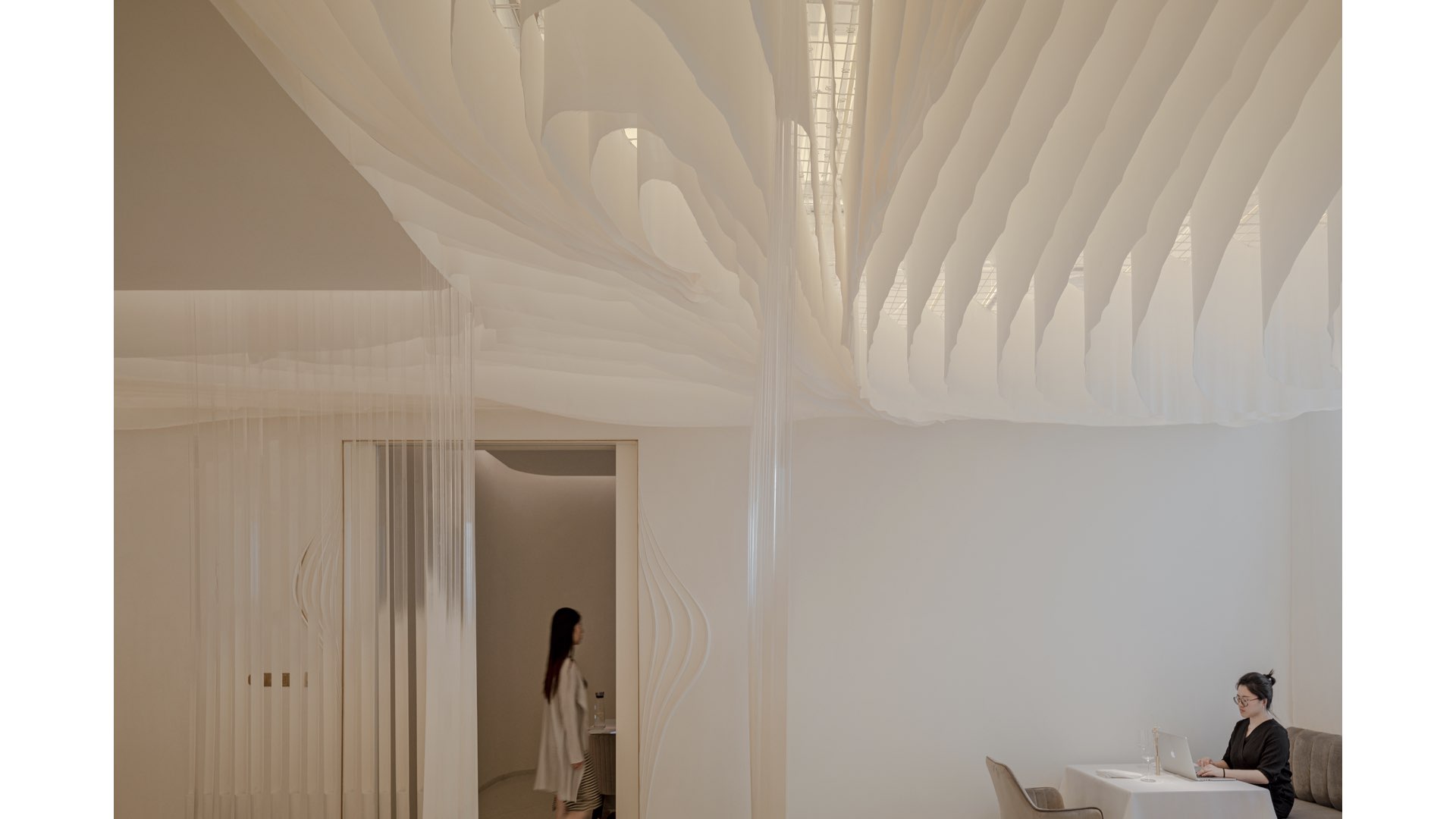 We use a lot of curved elements in order to create the atmosphere of water ripples. In the ceiling area, we use the suspended fabric to make the curve of the waves, which is a kind of dynamic water when the wind blows. The curtains are superimposed with the same fabric to increase the sensation of spatial depth. Regarding the wall decoration, we design curved lines through 3D printing technology. For the floor decoration, the curved metal lines are embedded within the terrazzo, responding to the overall style. In addition, the perfect combination of the line and surface is utilized to organize the curved elements in the space.