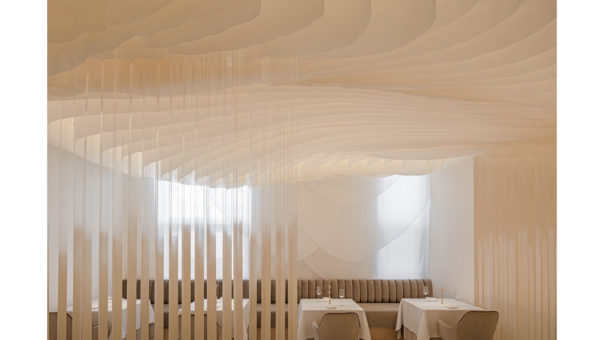 设计灵感来自于吃到美味食物味蕾被激发的一瞬间,如水波荡漾在口中,唤起全身的感官,沉浸在这美妙的交响中回味许久。空间以“水”为设计元素,整个色调保持纯白净透,如同白色画布一般衬托出一道道盛宴,使用餐成为一件有仪式感的事情。
