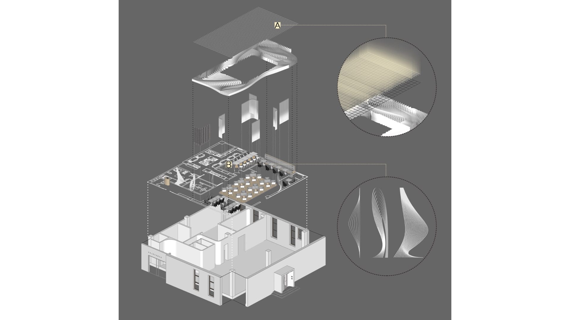 为了实现水波的氛围,我们运用了大量的曲线元素,天花区域我们利用悬挂的面料做成了曲线的波澜,随着风吹动,如同水波荡漾起来,是一种动态的水。窗帘运用同样的面料进行叠加,增强了空间层次感,在墙面上我们通过 3d 打印技术设计了一条条的曲线装饰线,地面水磨石上嵌入了弯曲的 金属线呼应整个风格,线面结合的设计方式将空间中的曲线元素统一了起来。