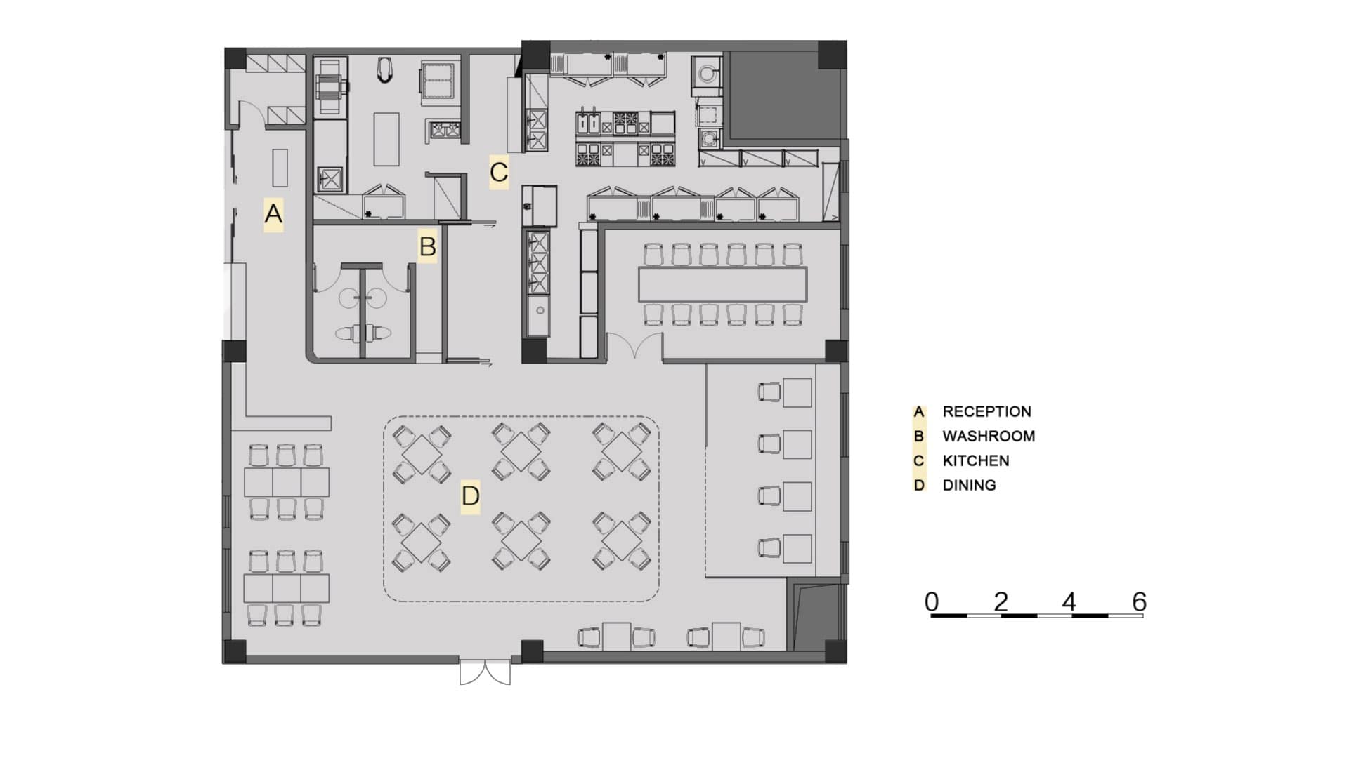 The restaurant not only provides the function of dining, but also serves as a place for socialization experience. We set a variety of dining scenes in the space as well as different seating arrangments through the division of the area. With capacities ranging from 2 to 12 guests, we cater to the needs of different dining scenes. The central area is seperated by translucent materials so that different areas are physically divided but visually connected. When people walk around, they will be delighted as they see different dimensions of space.