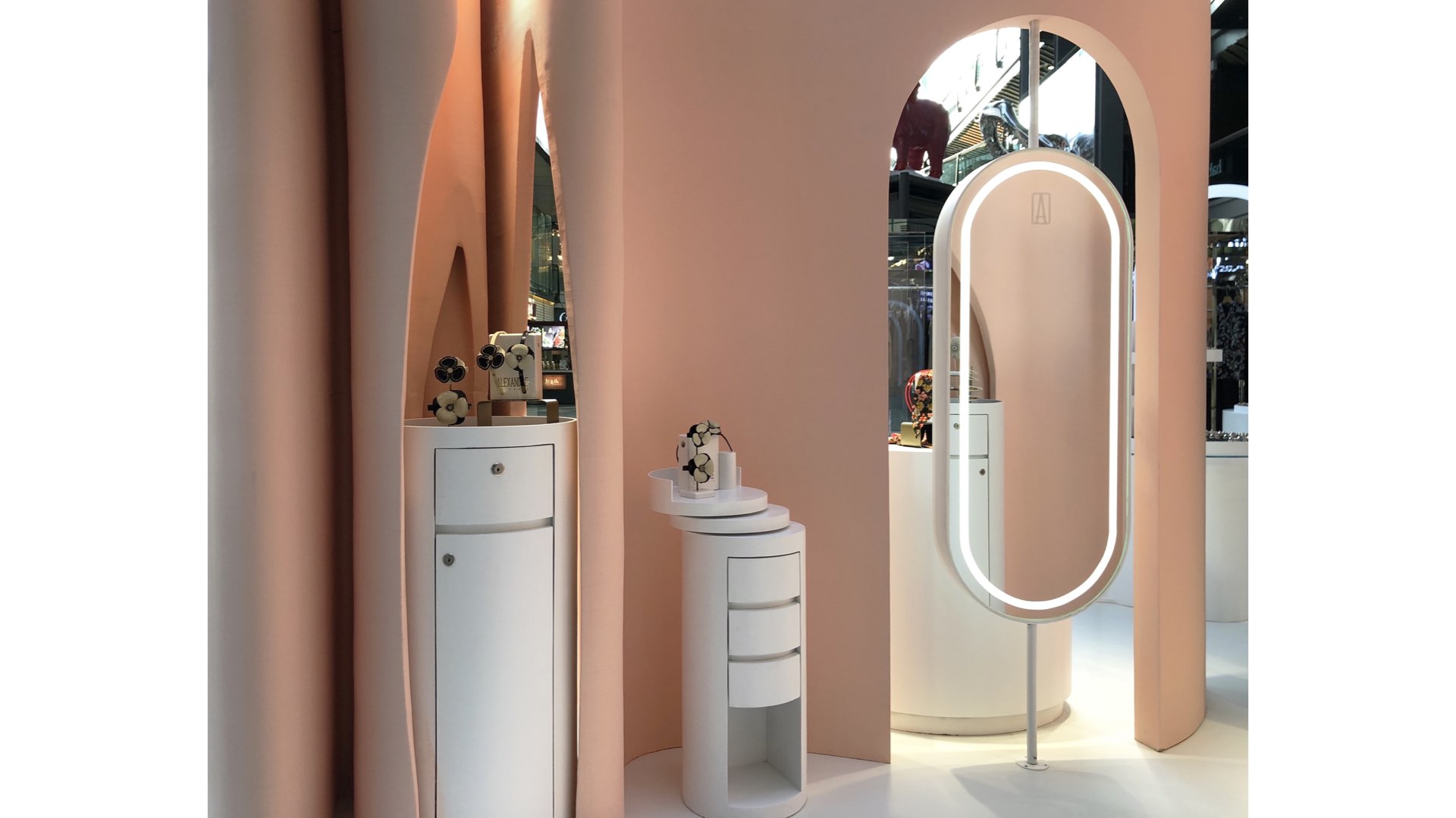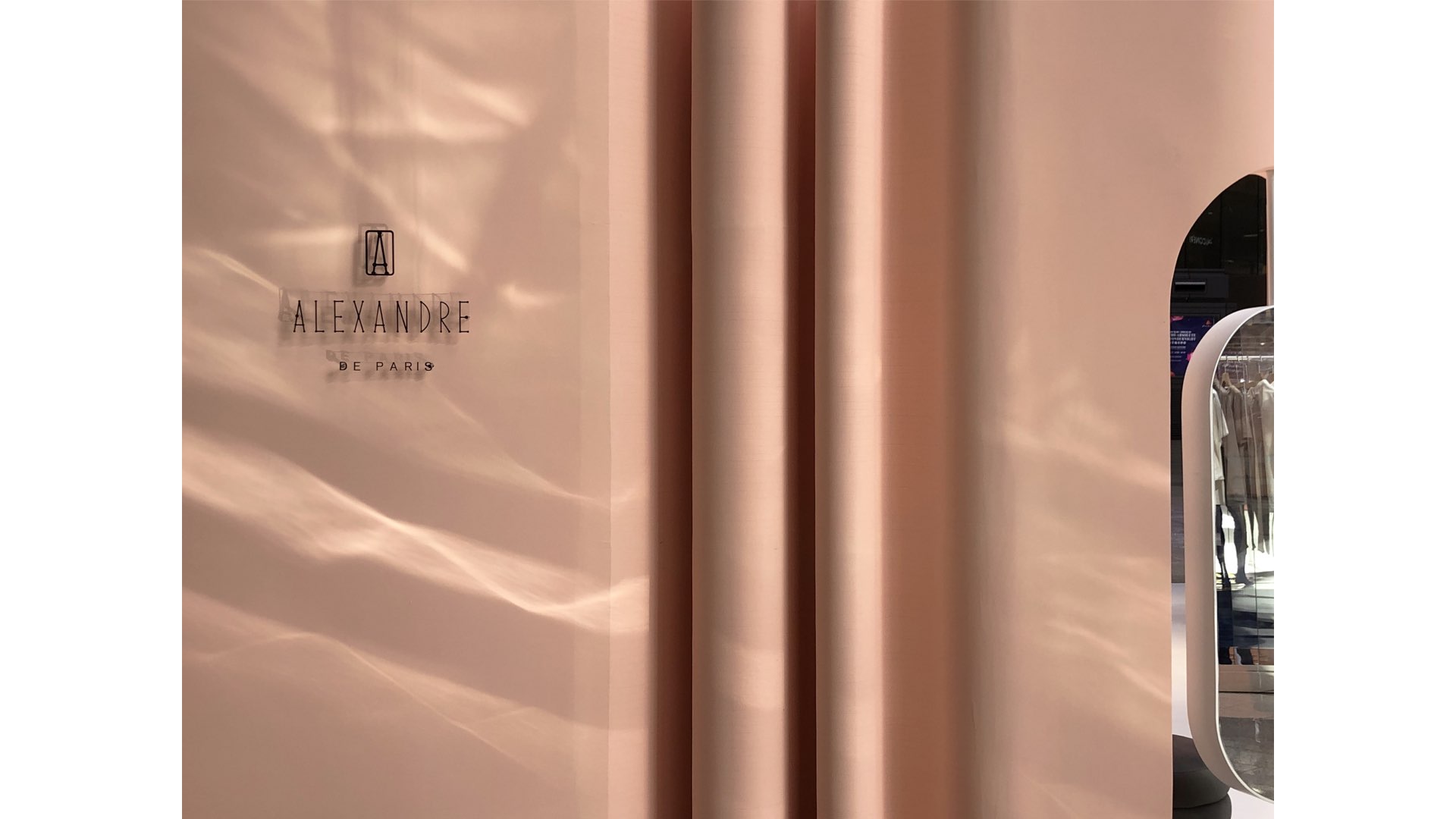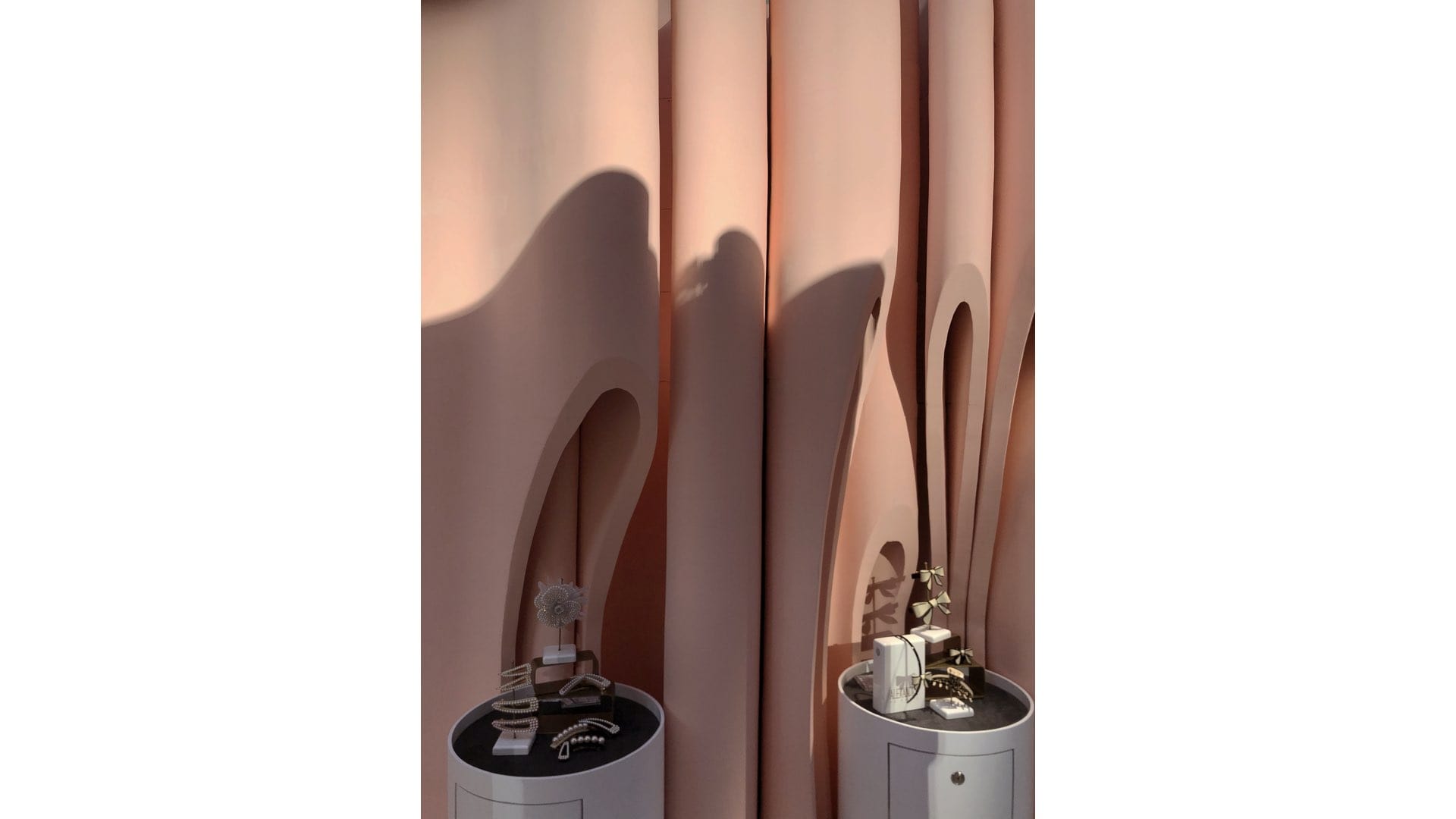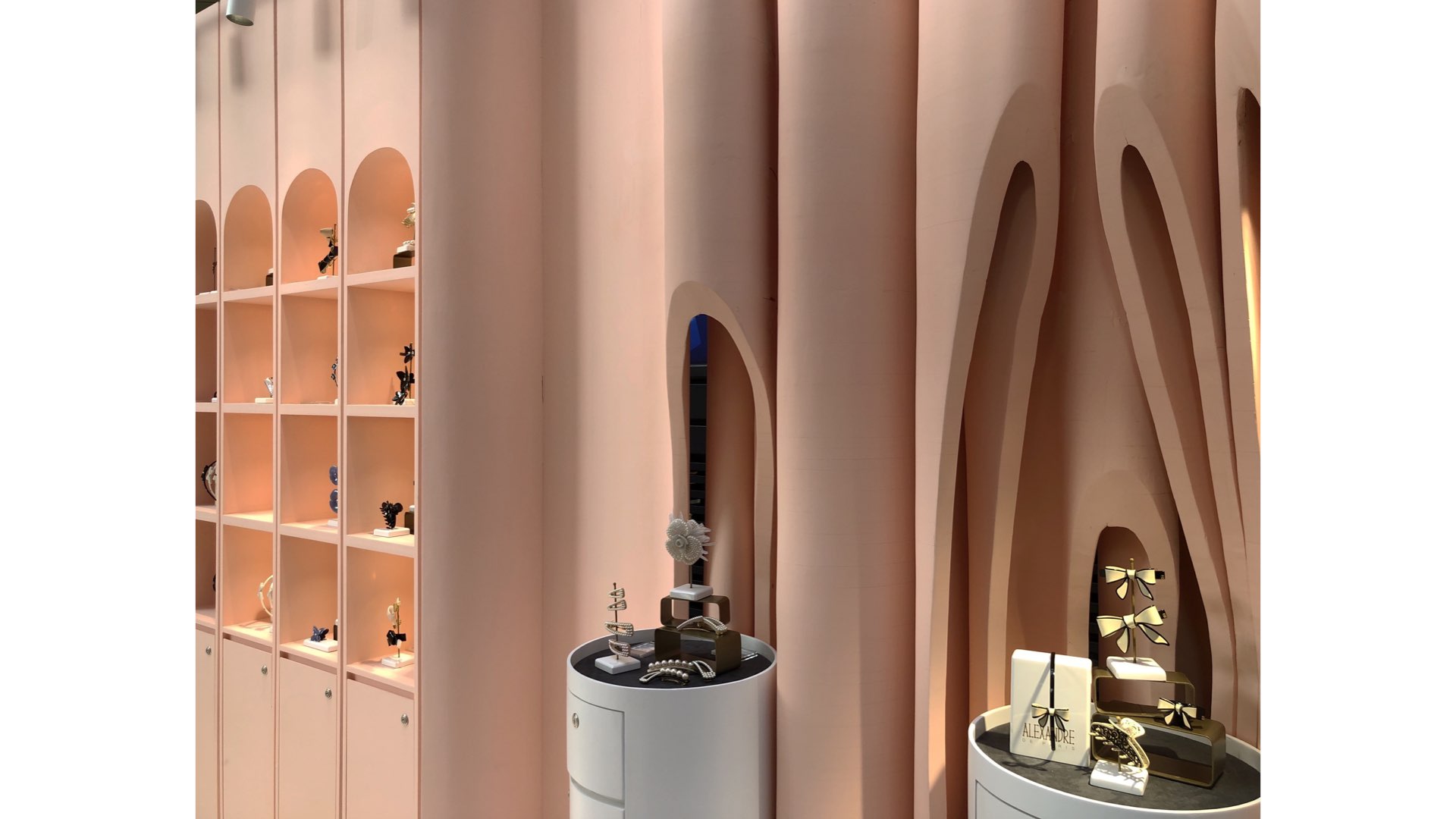 The brand comes from France, with rich historical background and inheritance stories. The product is aimed at women of different ages. Inspired by the flower, which is the most representative form of female elements, we use the abstract way to take the folds and cutting forms of flowers as the main expression elements of space, and evolve into walls and display furniture. The shadow on the walls is like waves of water , achieve the combination of dynamic and static, beautiful and warm space color, full of female atmosphere.
