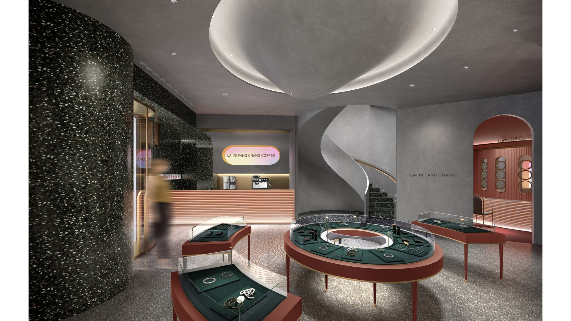 概念源自于品牌名称“来日方长”的寓意,美好的事物需要时间的酝酿,就像钻石一样,需要经历开采、分拣、切割、抛光之后才能成为璀璨的艺术品,让时光慢下来,让人在空间中享受当下,以光为主要元素来烘托空间神圣的氛围,通过墙面的造型渗出光来,光也游走在天花凹凸的造型中,形成品牌空间特殊的识别元素,带来更强的层次感与互动性,使人沉溺在时光中,发现美好,重拾自我。