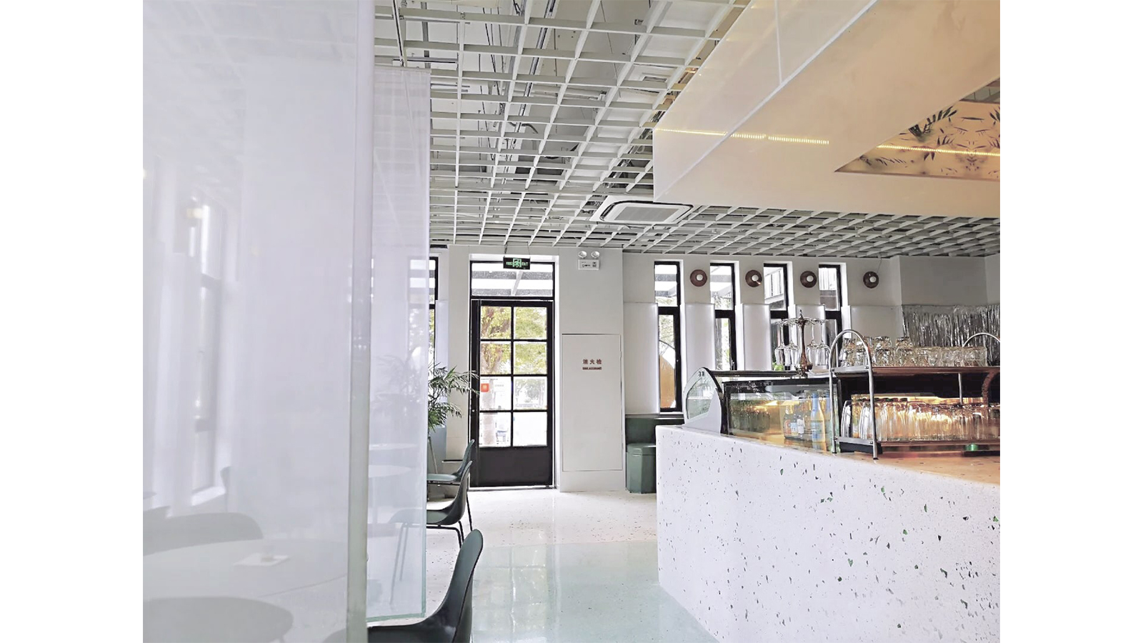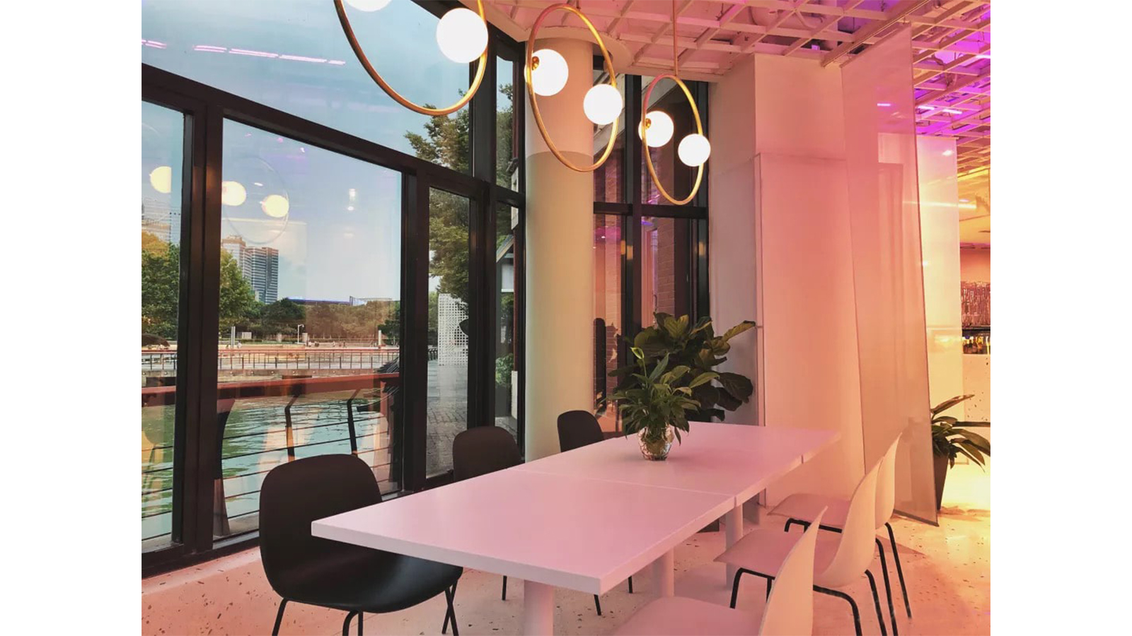 有阳光,有树,有空气,有水,引一室有氧空间。以开阔空间为基础,充分享受阳光,运用大片白色或亮色为基调,且在整个空间中点睛的绿植元素,轻松畅快,配合透明渐变丝网印刷的隔断,灵活的分隔组合空间,打造清新、自然放松舒心的氛围。