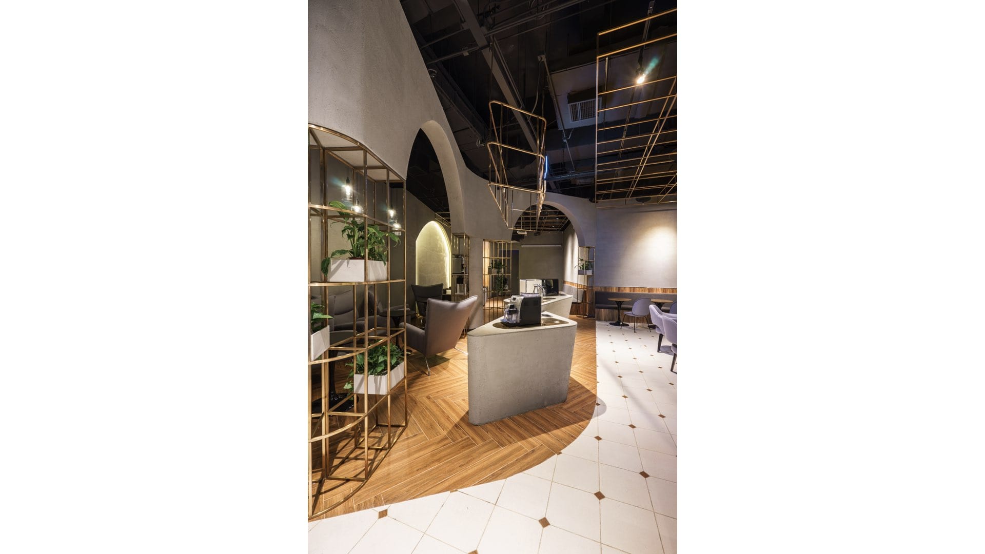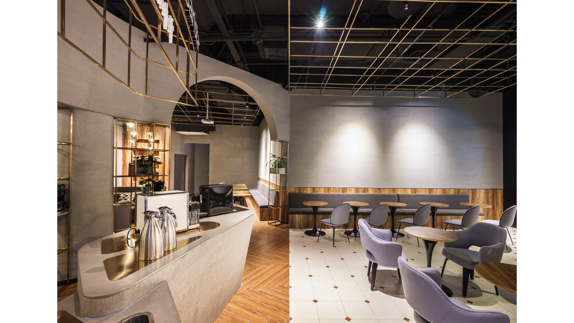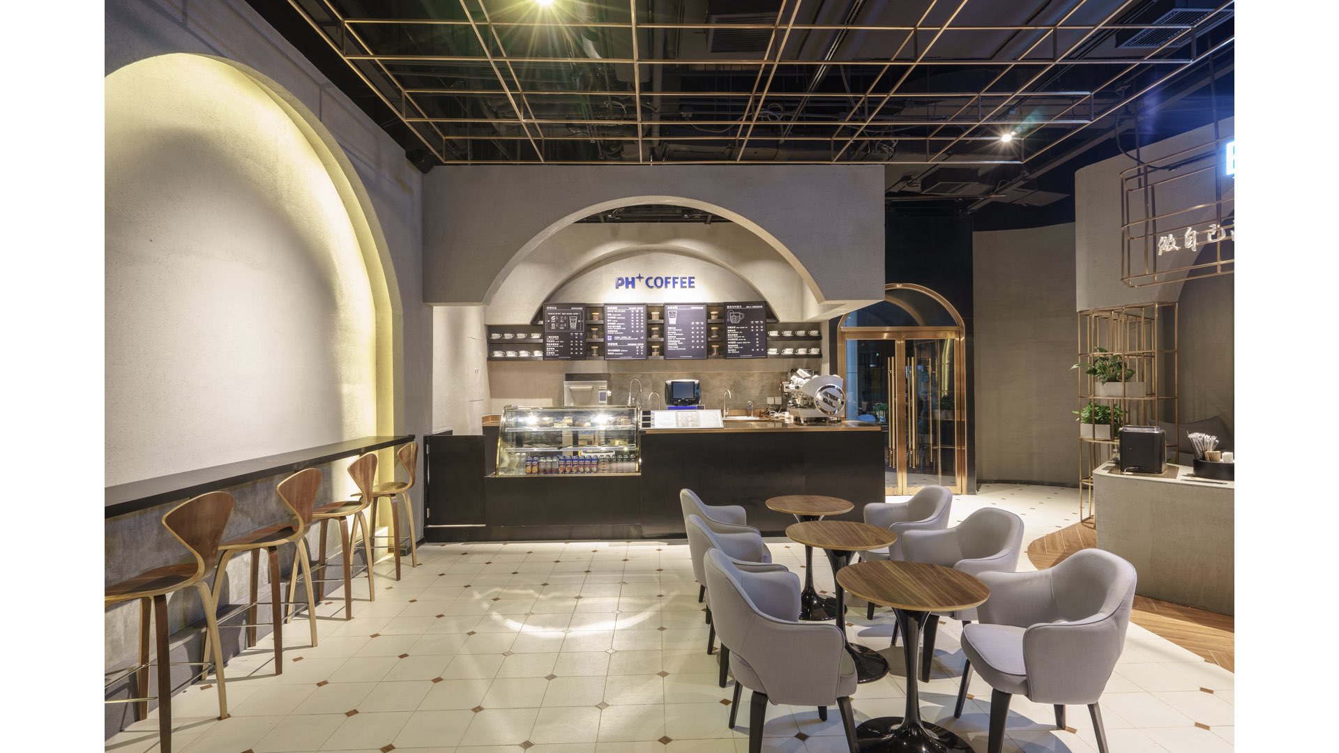“PH COFFEE stands for pure Italian coffee. We associate Italy with many representative ancient Roman architectures.” Drawing inspiration from Italian coffee,GB Space starts from arch elements of ancient Roman architectures, and hope to make guests feel European fascination in the space through the restoration of lines. Based on the same design idea, metal lattice ceiling is the simplified ceiling of church during the Renaissance. The selection of these two elements indulges guests into Italian coffee atmosphere.