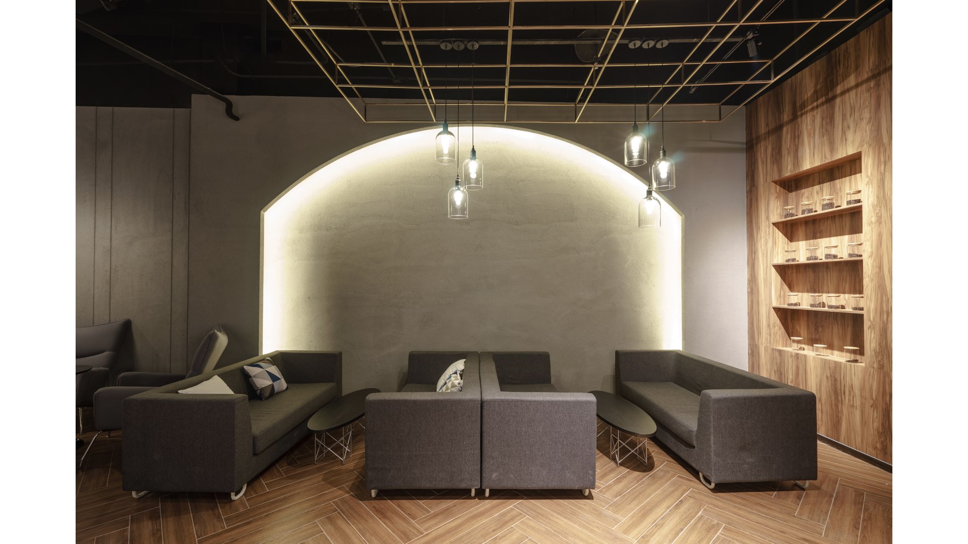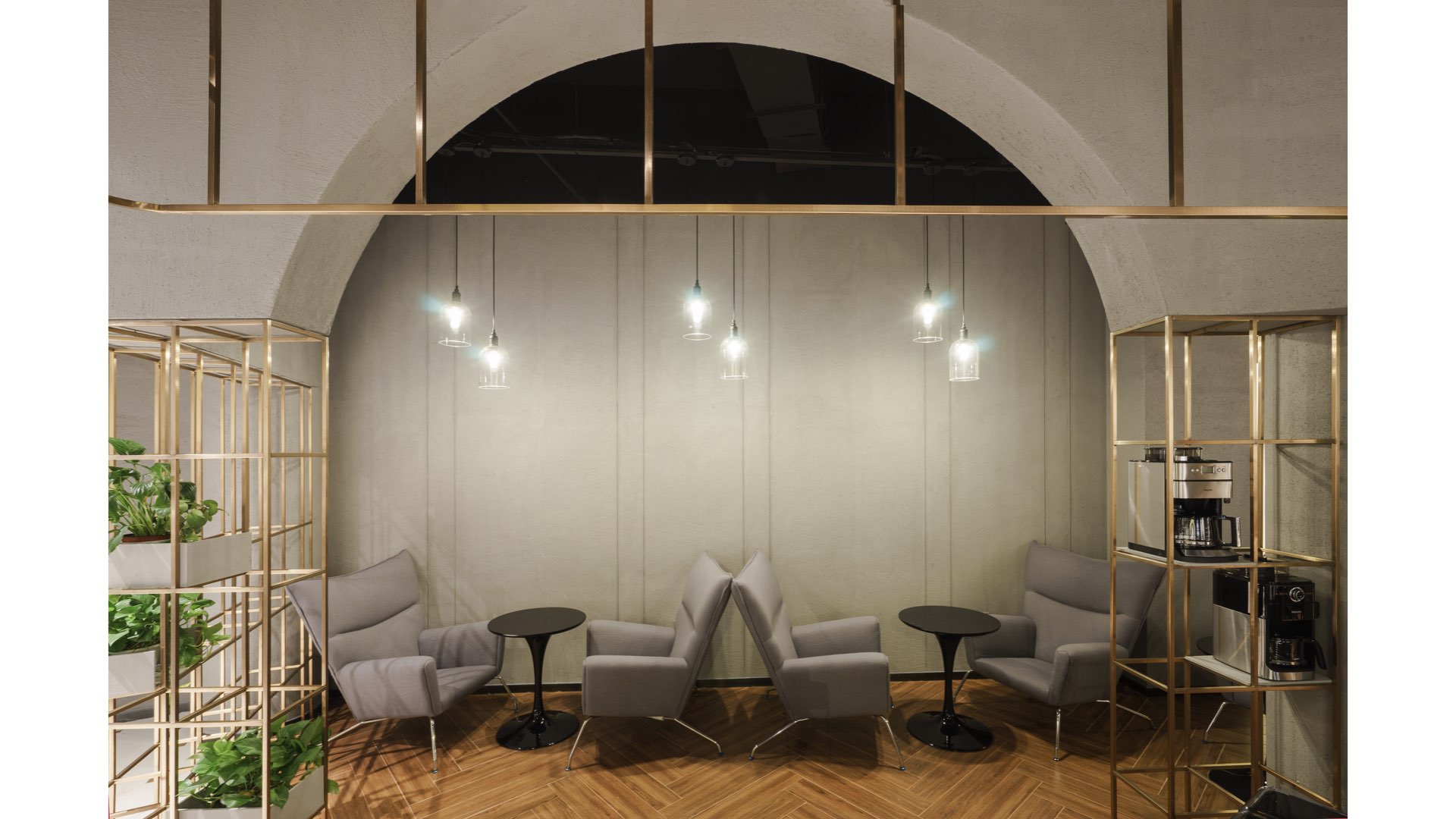 “飞利浦咖啡是纯正的意式咖啡,我们从意大利联想到很多具有代表性的古罗马建筑。”从意式咖啡中汲取灵感,设计方GB SPACE以古罗马建筑的拱形元素作为项目设计的起始,希望通过线条的还原,让客人在空间内感受到简欧洲的感觉。基于同一设计理念,金属格子天花则是简化的文艺复兴时期教堂的天花。这两种元素的选用无形中唤起了异国客人对意式文化的共鸣。